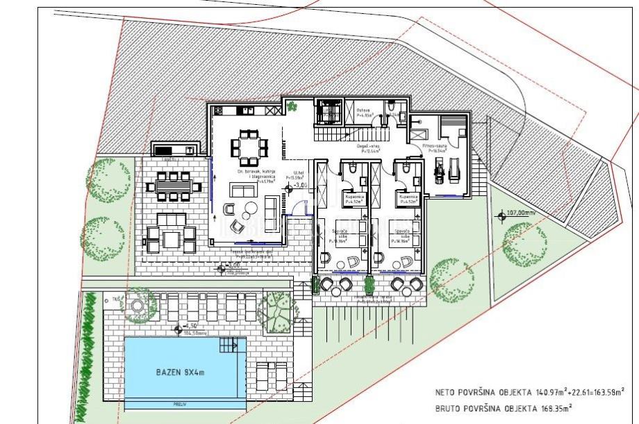 Projektirana vila obuhvaća dvije etaže (prizemlje i kat), s ukupnom neto površinom od 241,36 m² i bruto površinom od 317,61 m². Arhitektonsko rješenje temelji se na suvremenom dizajnu, visokoj funkcionalnosti, maksimalnoj privatnosti te skladnom uklapanju u prirodni ambijent.