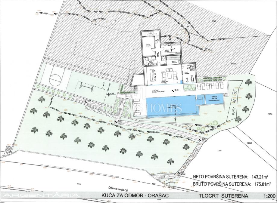 U podrumu se nalazi prostor za poslugu od 42,17 m². U suterenu je smješten luksuzni wellness prostor s bruto površinom od 175,81 m², koji uključuje fitness studio, hodnik, garderobu, saunu, veliki lounge bar, te sunčalište. Vanjski prostor upotpunjuju bazen, dječji bazen i prostrani park s dječjim i košarkaškim terenom, idealni za obiteljski odmor i rekreaciju.