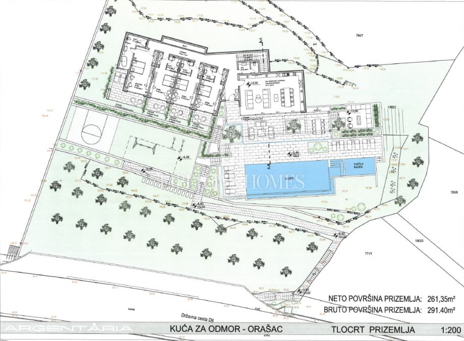 Prema projektu, planirana je kuća za odmor s bruto površinom objekta od 509,38 m², koja uključuje dva kata. U prizemlju površine 291,40 bruto se nalaze četiri sobe, svaka s vlastitom kupaonicom i terasom, uključujući jednu luksuznu master sobu. Tu je i prostrani dnevni boravak, velika kuhinja, te prostrana terasa koja nudi idealno mjesto za opuštanje i uživanje u prirodi.