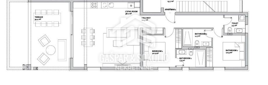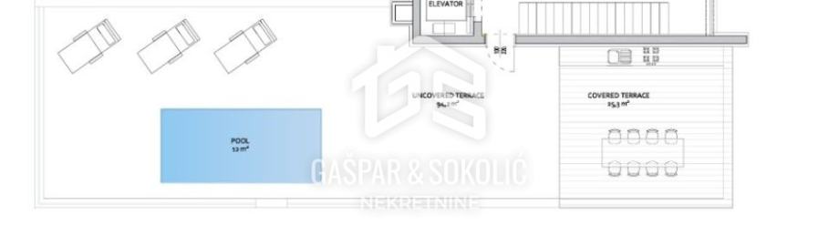Jedna od ključnih prednosti ovog stana je krovna terasa s bazenom površine 119,55 m², koja pruža privatni prostor za opuštanje i rekreaciju na otvorenom. Stan dolazi s dodatnim pripatcima, uključujući spremište i dva garažna parkirna mjesta, čime se osigurava dodatna praktičnost.