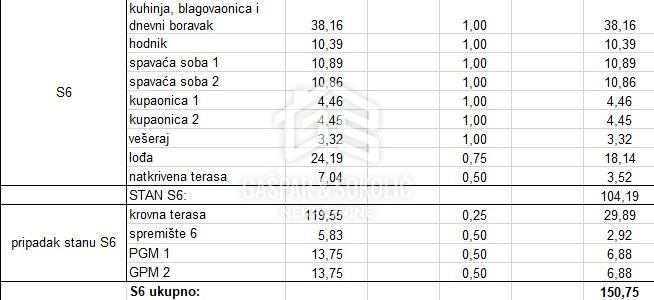 Ukupna površina stana S6, uključujući pripatke, iznosi 150,75 m², čineći ga idealnim za one koji traže vrhunski opremljen i luksuzan prostor na prestižnoj lokaciji. Ovaj stan predstavlja savršeni izbor za obitelji ili pojedince koji žele živjeti u modernom, komfornom i ekskluzivnom ambijentu.