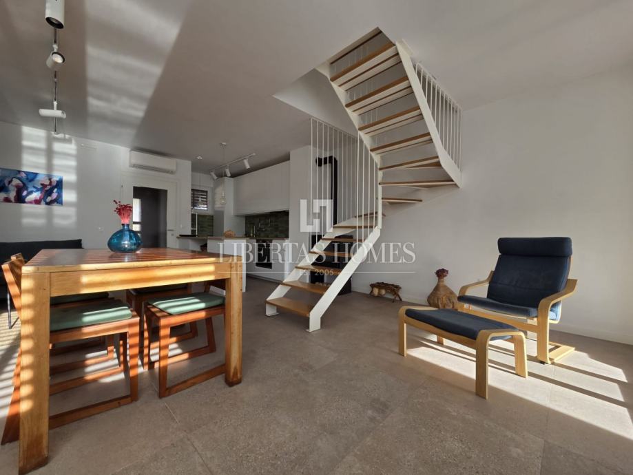 Unutarnji raspored je iznimno lijep i logičan, a stan se sastoji od prostrane dnevne zone u kojoj su skladno povezani dnevni boravak, kuhinja i blagovaonica, dok su se dvije udobne spavaće sobe smjestile u mansardi. Mansarda prostoru daje dodatnu vrijednost, prozračnost i osjećaj topline, dok obilje prirodnog svjetla dodatno naglašava ugodnu atmosferu u cijelom stanu.