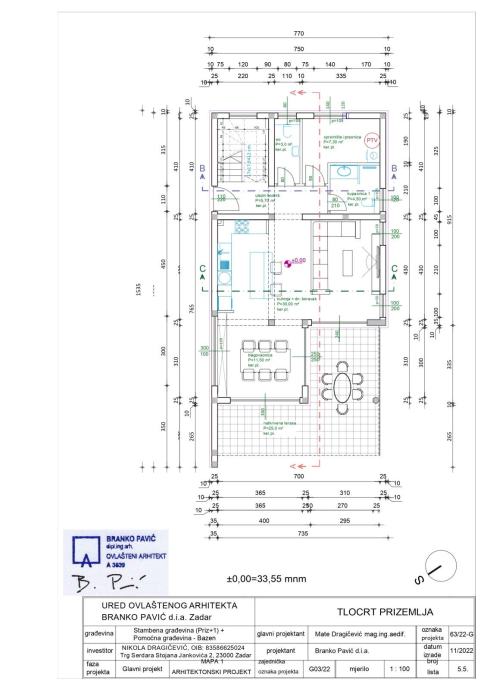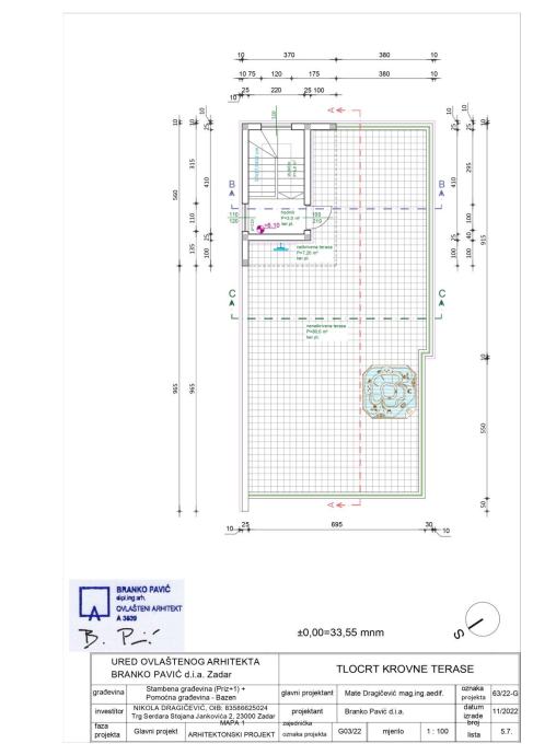 Objekt se sastoji od prizemlja, kata i prohodne krovne terase. U prizemlju se nalaze kuhinja s blagovaonicom i dnevnim boravkom, WC, hodnik, kupaonica, praonica, te izlaz na natkrivenu terasu. Unutarnje dvokrako stubište vodi na kat gdje se nalaze tri spavaće sobe, dvije kupaonice, te tri natkrivene terase - svaka soba ima vlastiti izlaz. Dodatnim stubištem dolazi se do prostrane krovne terase, koja uključuje natkriveni i otvoreni dio na kojoj će biti postavljena moderna pergola i jacuzzi, kao i vanjski tuš, što je čini savršenim mjestom za opuštanje s pogledom na more.