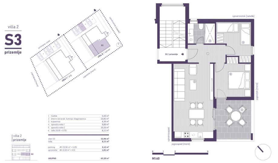 Prodaju se stanovi površine 65,2 m2 u novogradnji na prizemlju i prvom katu, smješteni svega 80 metara od mora i plaže. Svaki stan ima prekrasan pogled na more, parkirališno mjesto i spremište u suterenu.