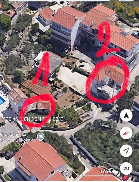 Prodaju se dva objekta. Jedan je obiteljska kuća za renovaciju koja se sastoji od obracunski 90m2. Kuća je za renovaciju. Ima prekrasnu terasu s pogledom na centar Trogira i rivu. Drugi objekat je za studio apartman i ima legalan objekat od 19m2 na parceli od 112 m2 s parkirnim mjestom.