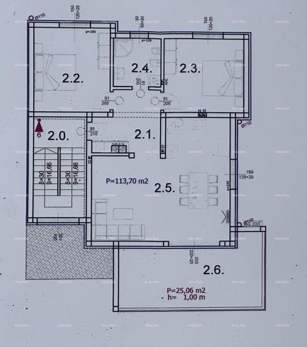 Prostrani stan, površine 113,70 m², smješten je na 1.katu novogradnje i sastoji od hodnika, dvije spavaće sobe, dnevnog boravka, kuhinje, kupaonice i terase.