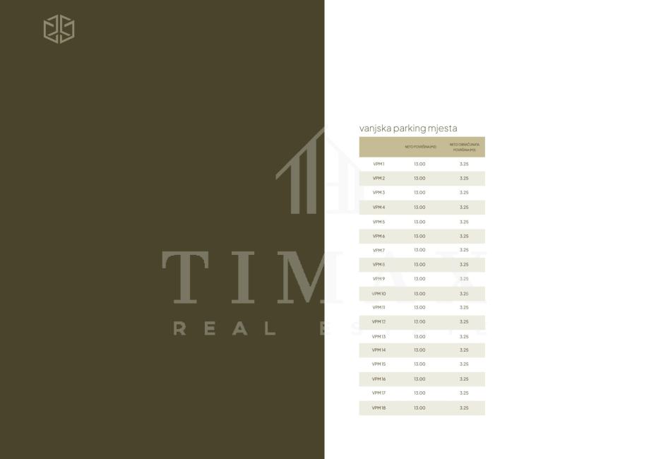 Vanjska parking mjesta smještena na dvorišnom dijelu zgrade te garažna parking mjesta smještena u podrumu s direktnim pristupom stubištu i dizalu.