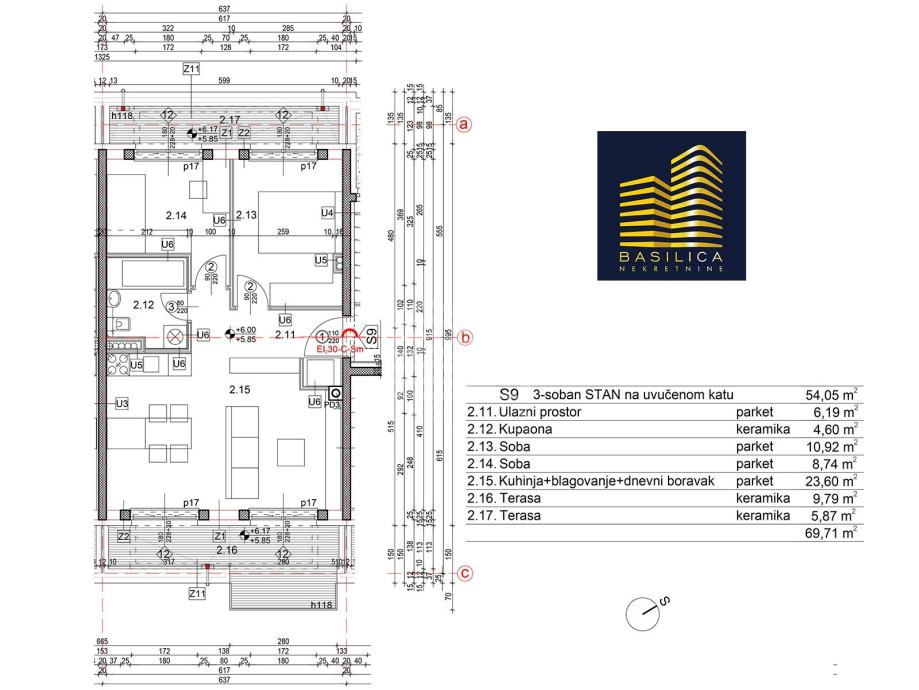 Stan oznake S9 nalazi se na 2. katu, trosoban je, te se sastoji od: ulaznog hodnika, kupaonice, dnevnog boravka sa kuhinjom i blagovaonicom, dvije spavaće sobe i dvije terase, ukupne prodajne površine 61,09 m2.