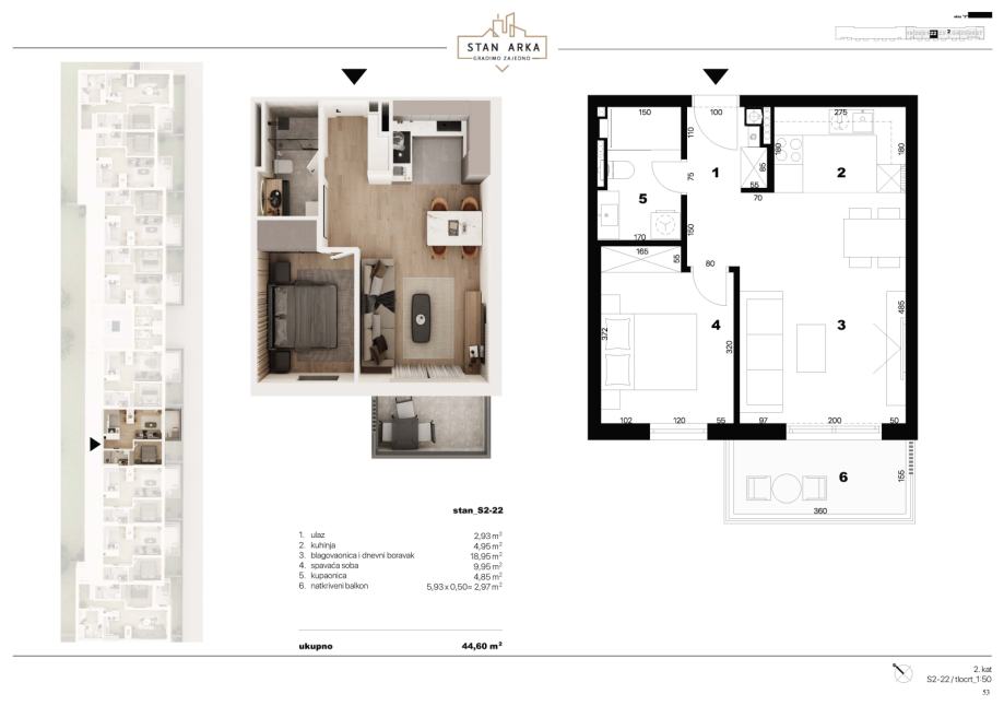 STAN S2-22 - 44,60 m2, 2-sobni, nalazi se na drugom katu (ULAZ 2)