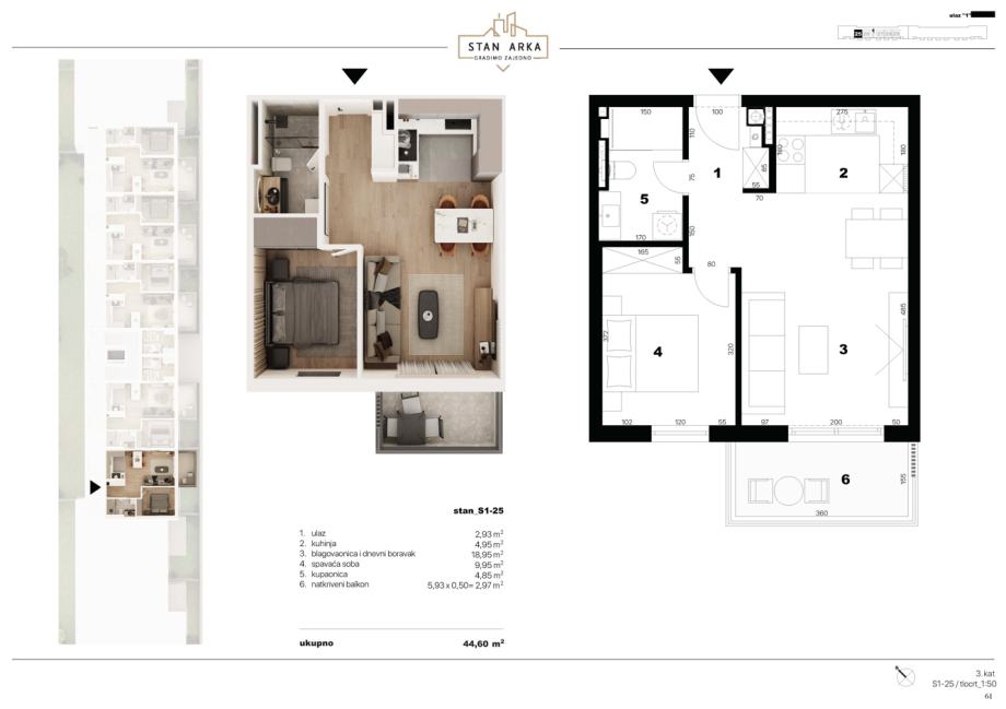 STAN S1-25-44,60 m2, 2-sobni, nalazi se na trećem katu (ULAZ 1)