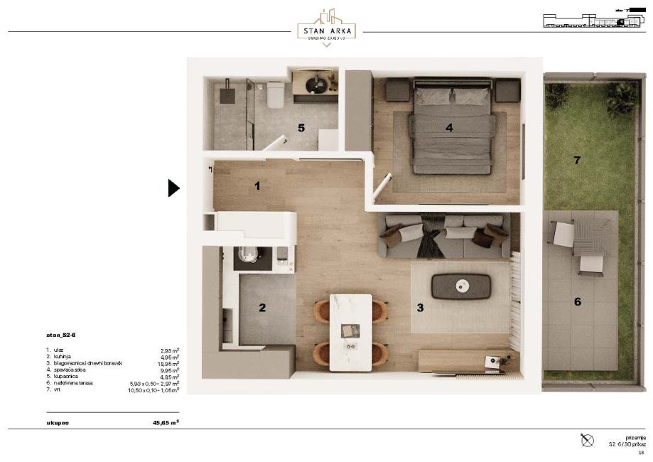 Ukupna površina s parkirnim mjestom i spremištem: 51,55 m²