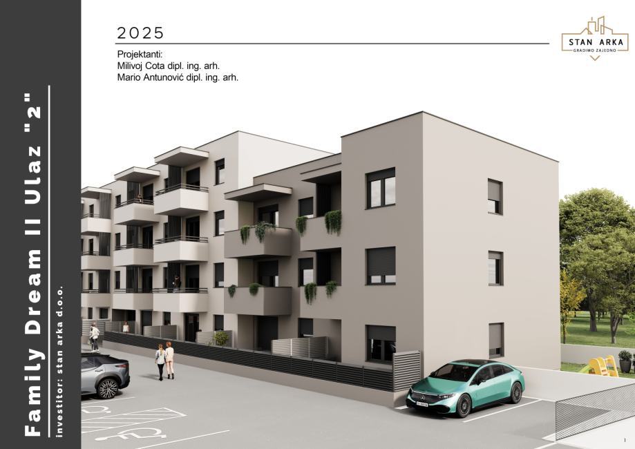 Projekt "FAMILY DREAM II” je visokokvalitetna, protupotresno projektirana novogradnja koja se nalazi u naselju Botinec, Ulica dr. Luje Naletilića. Sastoji se od 62 moderno i funkcionalno izgrađena stana raspoređena u dva ulaza (ULAZ 1 i ULAZ 2). Zgrada ima podrumsku etažu (spremište), prizemlje, 2 kata i 3. uvučeni kat.