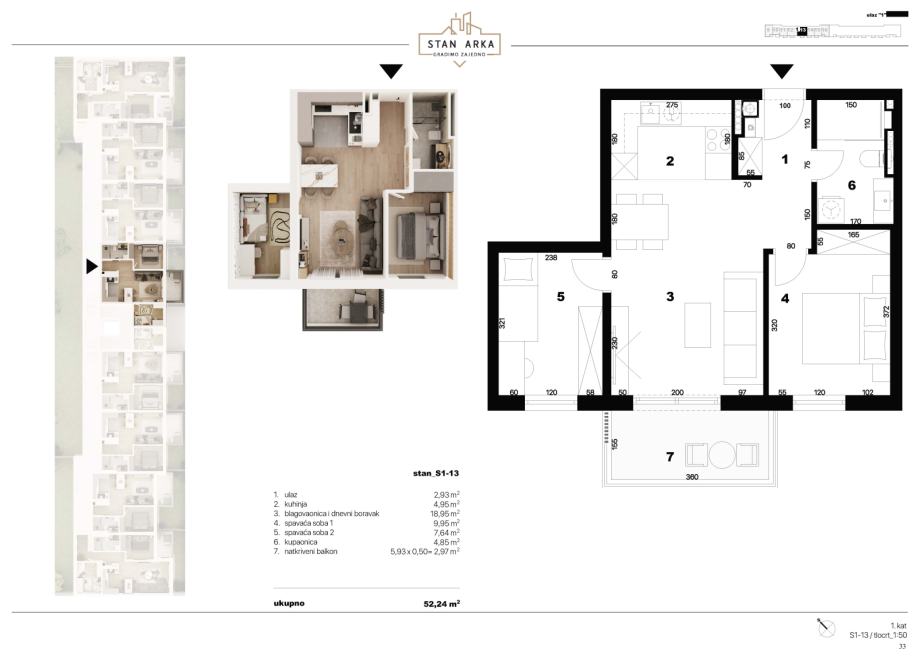 STAN S1-13 - 52,24 m2, 3-sobni, nalazi se na prvom katu (ULAZ 1)