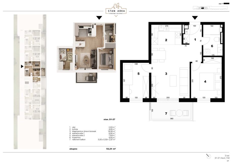 STAN S1-27 - 52,24 m2, 3-sobni, nalazi se na trećem katu (ULAZ 1)