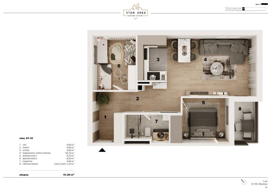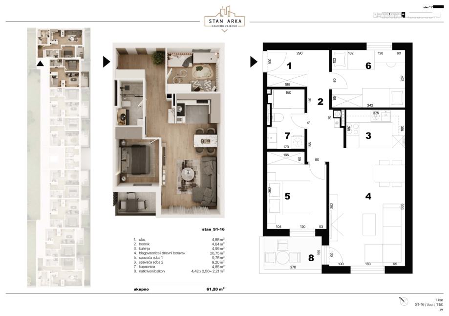 STAN S1-16 - 61,20 m2, 3-sobni, nalazi se na prvom katu (ULAZ 1)