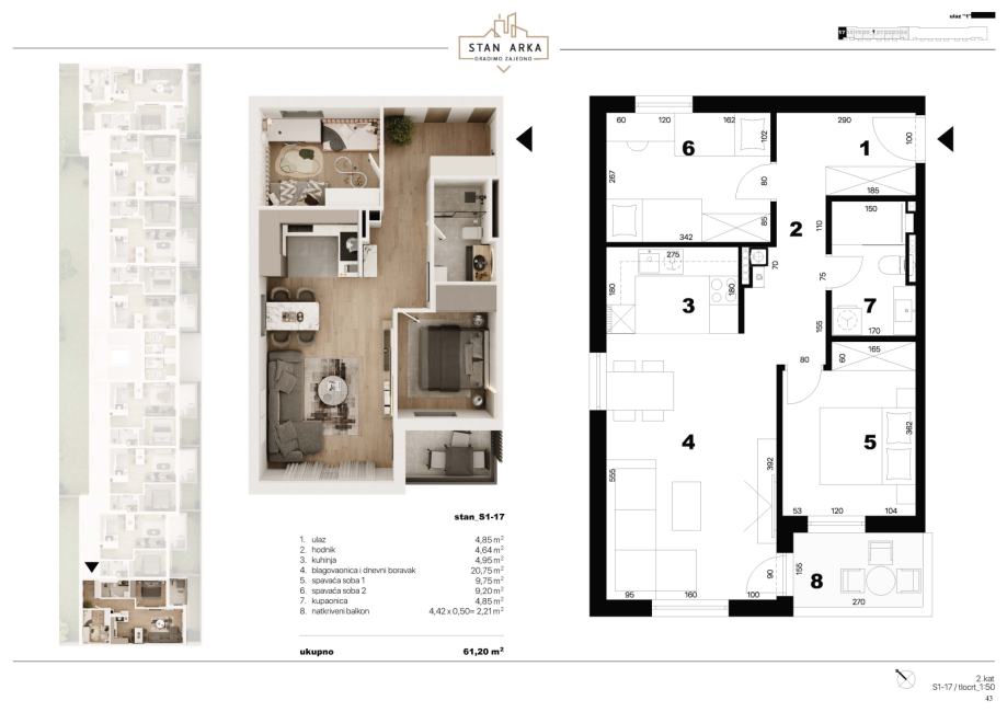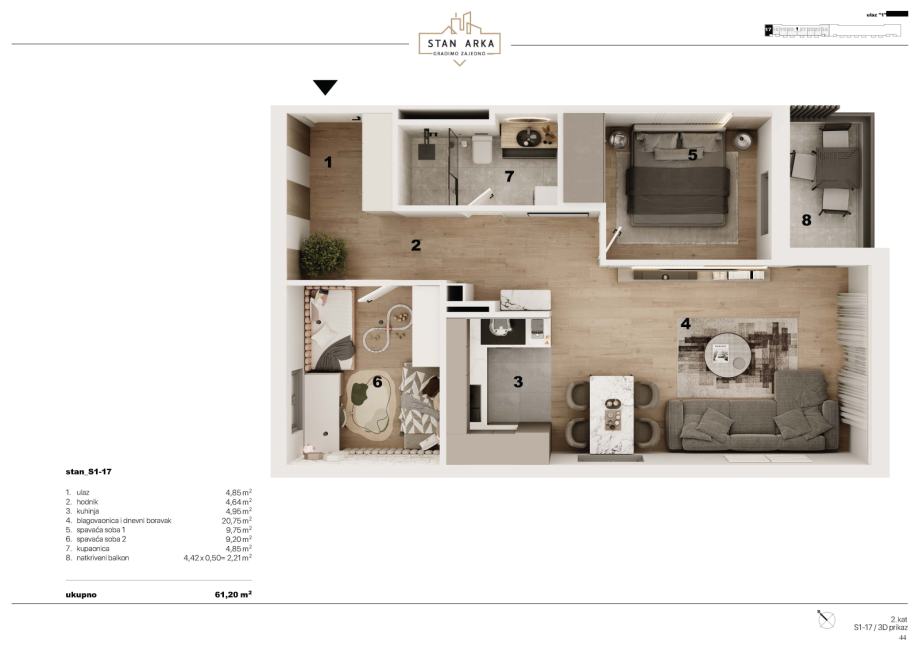 STAN S1-17 - 61,20 m2, 3-sobni, nalazi se na drugom katu (ULAZ 1)