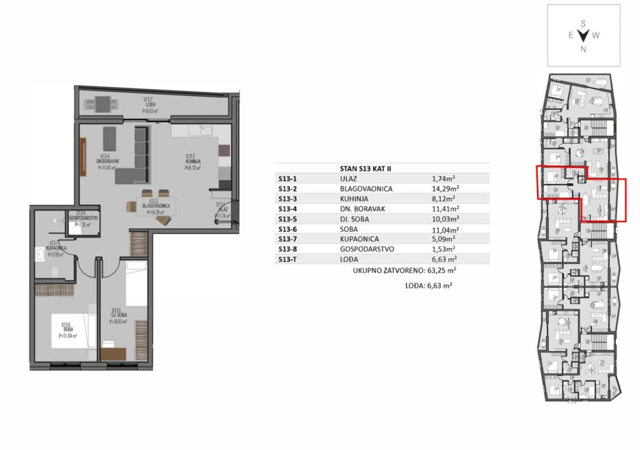 Stanu S13 pripada nenatkriveno parkirno mjesto, individualno spremište i zajedničko spremište za ostavljanje bicikala, romobila i sl. koji su uključeni u cijenu.