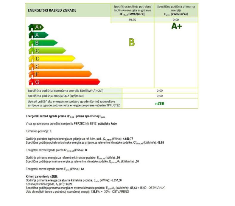 Projekt obuhvaća samostojeću samoodrživu nisko energetsku kuću na dvije etaže sa solarnom elektranom na krovu, grijanje putem dizalice topline uz energetski razred A+. U prizemlju kuće nalazi se garaža, ulazni hodnik, WC, blagovaona i dnevnik boravak s kuhinjom, terasa (30 m2) te stepenice s kojima se dolazi na drugu etažu. Tu se nalaze hodnik, dvije spavaće sobe, WC, wellness zona i natkrivena terasa (18 m2).