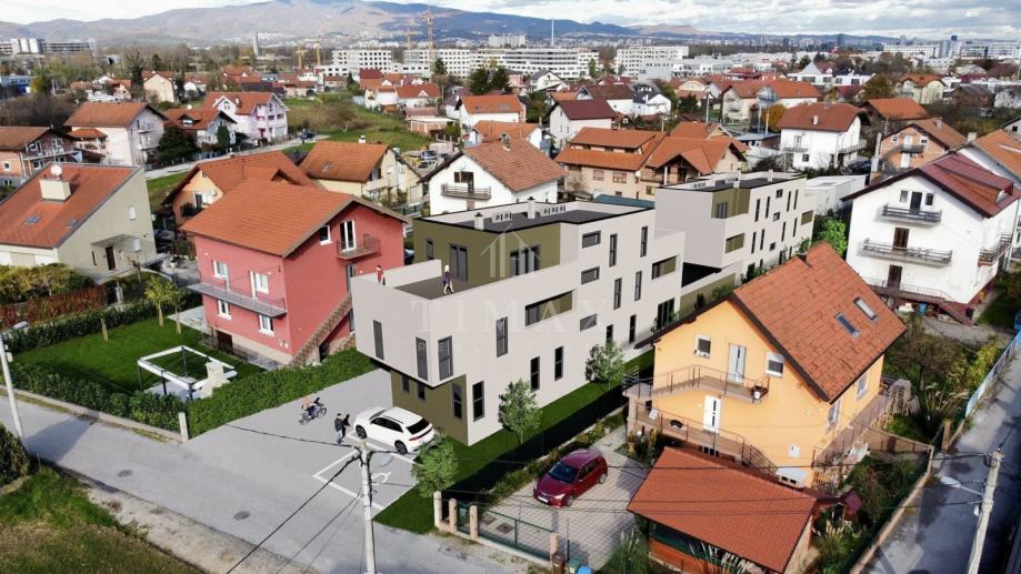 Penthouse na zadnjem katu (drugom) preko cijele etaže. Stan površine 104,37 m2 nalazi se u Blatu - Novi Zagreb. Sastoji se od hodnika, dvije kupaonice, tri spavaće sobe, spremišta, "open space" prostora u kojem su smješteni blagovaonica, kuhinja i dnevni boravak, dvije velike terase i vanjskog parking mjesta.