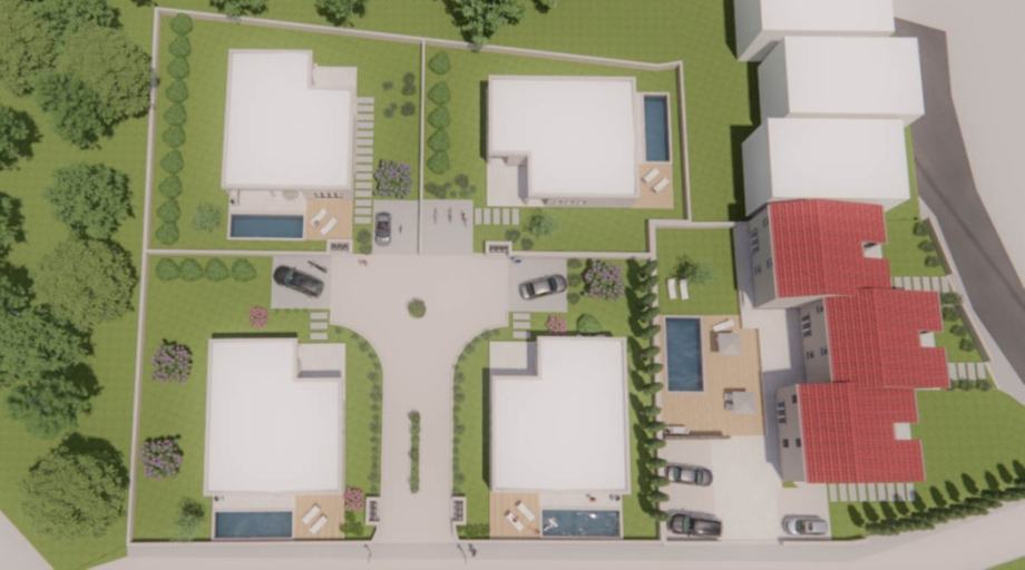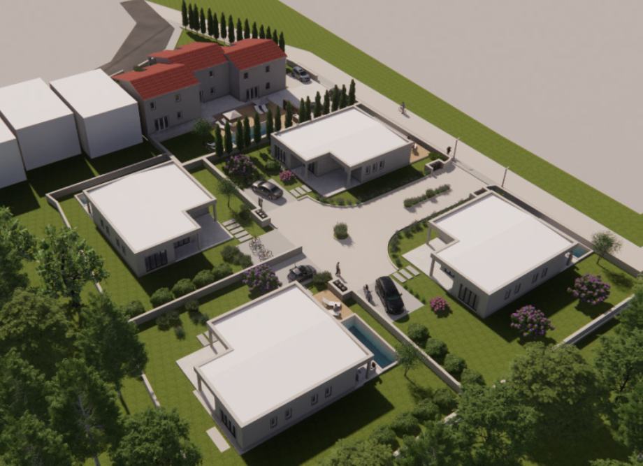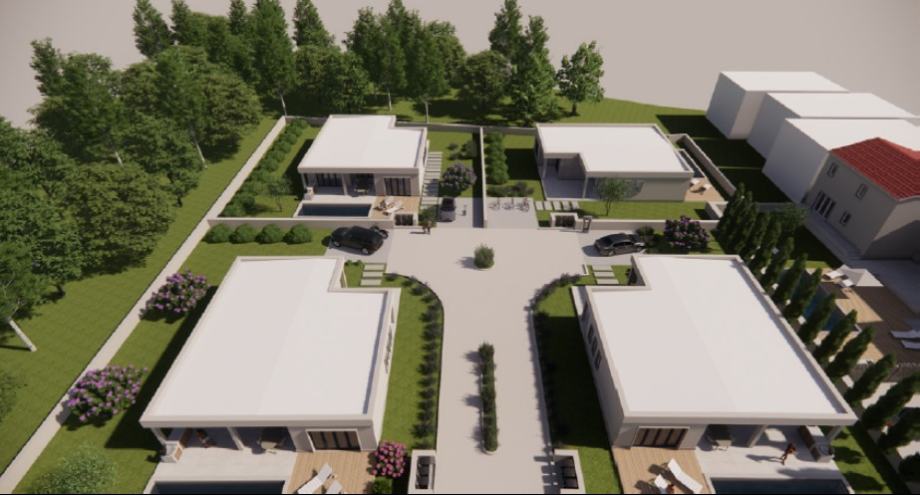 Prodaje se građevinsko zemljište s projektom, građevinskom dozvolom i svom projektnom dokumentacijom za izgradnju 4 vile i 3 kuće u nizu, Brtonigla- Grobice.