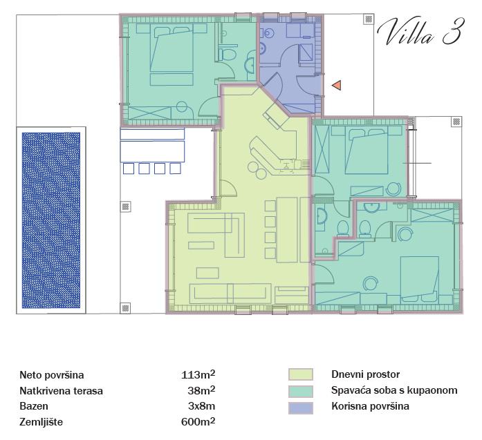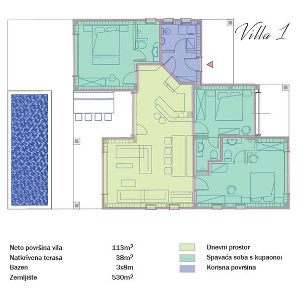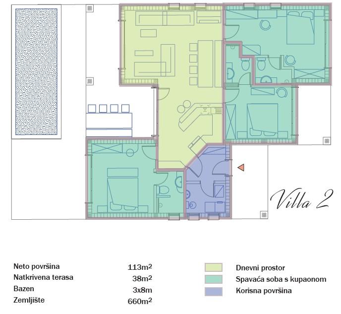 S neto površinom vila od 113m2 i površinom natkrivene terase od 38m2, ove vile pružaju savršenu ravnotežu između opuštanja i luksuza, nudeći nezaboravan boravak za svakog gosta.