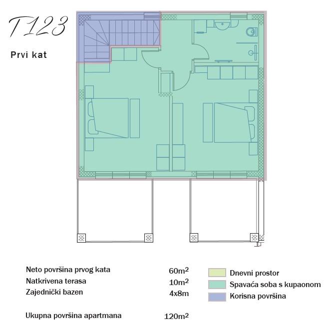 Na gornjem katu nalaze se dvije spavaće sobe i zajednička kupaonica, pružajući privatnost i udobnost s obiljem prirodnog svjetla i prostora za pohranu. Kupaonica je moderno opremljena za potpunu udobnost.
