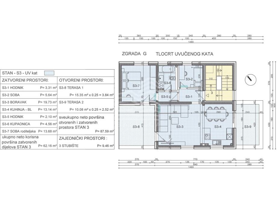 Stan G3 nalazi se na 2. katu i sastoji se od hodnika, kupaonice, dvije sobe, dnevnog boravka sa kuhinjom i blagovaonicom, terase, spremišta i parkirnog mjesta. Ukupna prodajna površina 73,71 m2.
