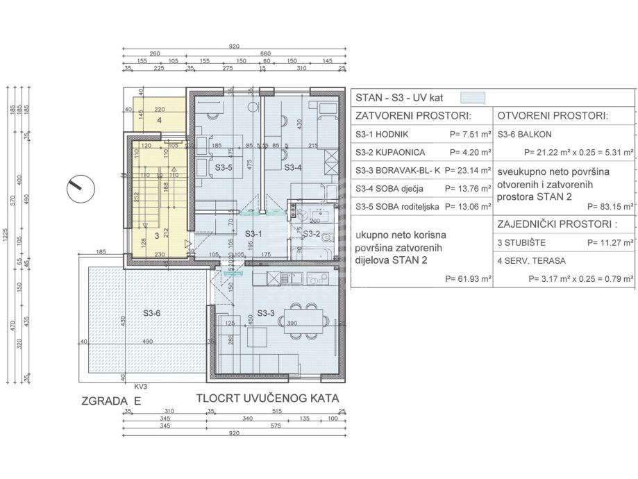 Stan E3 nalazi se na 2. katu i sastoji se od hodnika, kupaonice, dvije sobe, dnevnog boravka sa kuhinjom i blagovaonicom, terase, spremišta i parkirnog mjesta. Ukupna prodajna površina 70,37 m2.