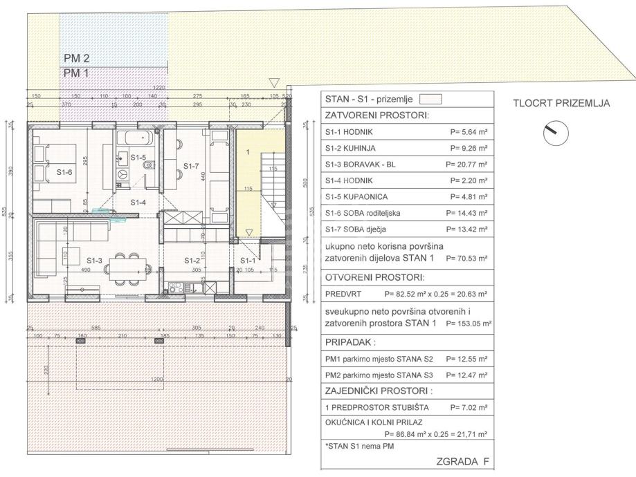 Stan F1 nalazi se u prizemlju i sastoji se od hodnika, kupaonice, dvije sobe, dnevnog boravka sa kuhinjom i blagovaonicom i vrta. Ukupna prodajna površina 81,38 m2.