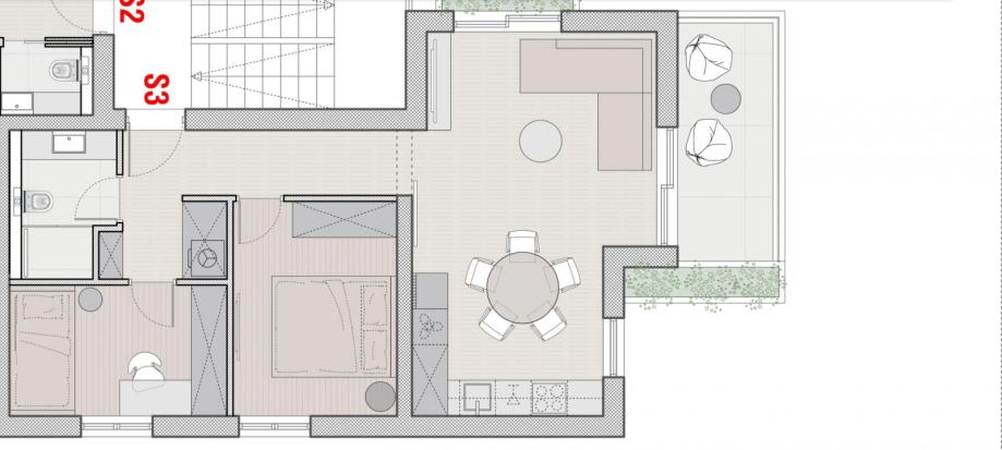 Stan na prvom katu južne orijentaccije koji se sastoji od dvije spavaće sobe kupaonice te kuhinje s blagovaonicom i dnevnog boravka.