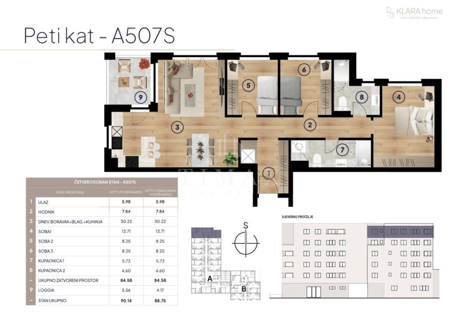Projekt KLARA home, Četverosoban stan A507S, peti kat, 88,75 m2 (prodaja)