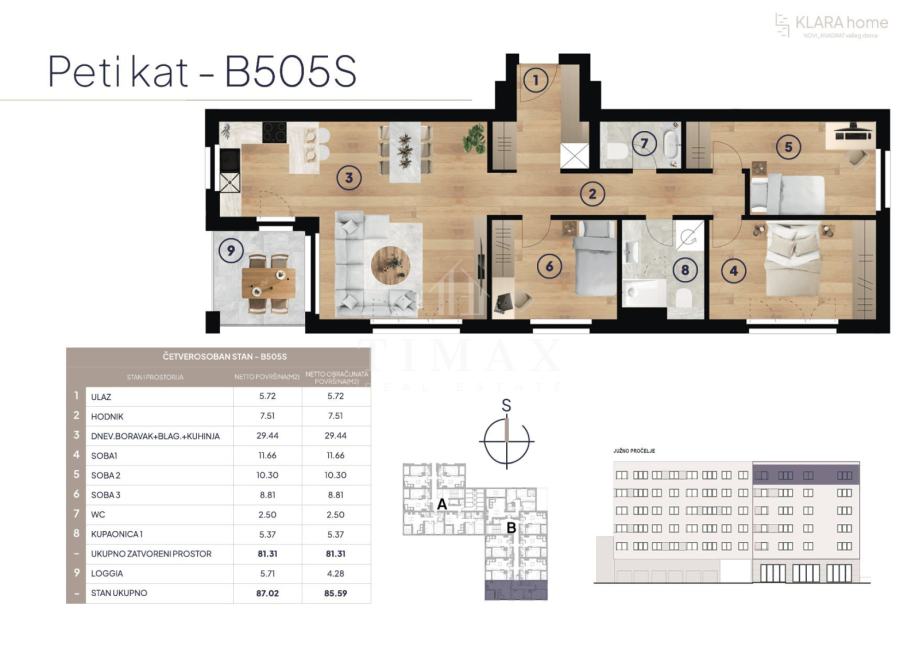 Projekt KLARA home, Četverosoban stan B505S, peti kat, 85,59 m2 (prodaja)