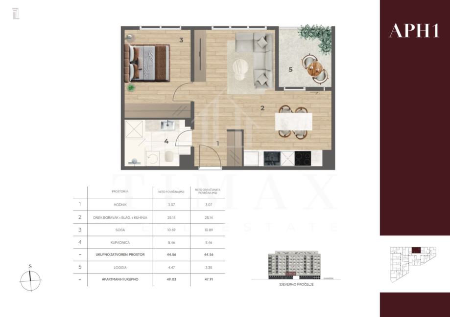 Dvosoban apartman oznake H1, na prvom katu, površine 47,91 m2.