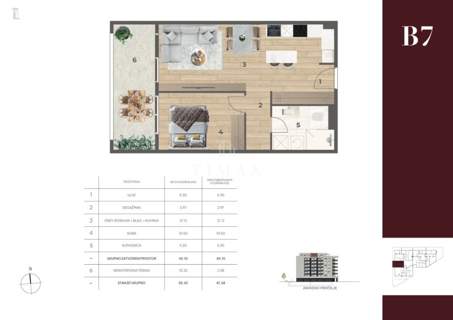 Dvosoban stan oznake B7, na sedmom katu, površine 47,68 m2.