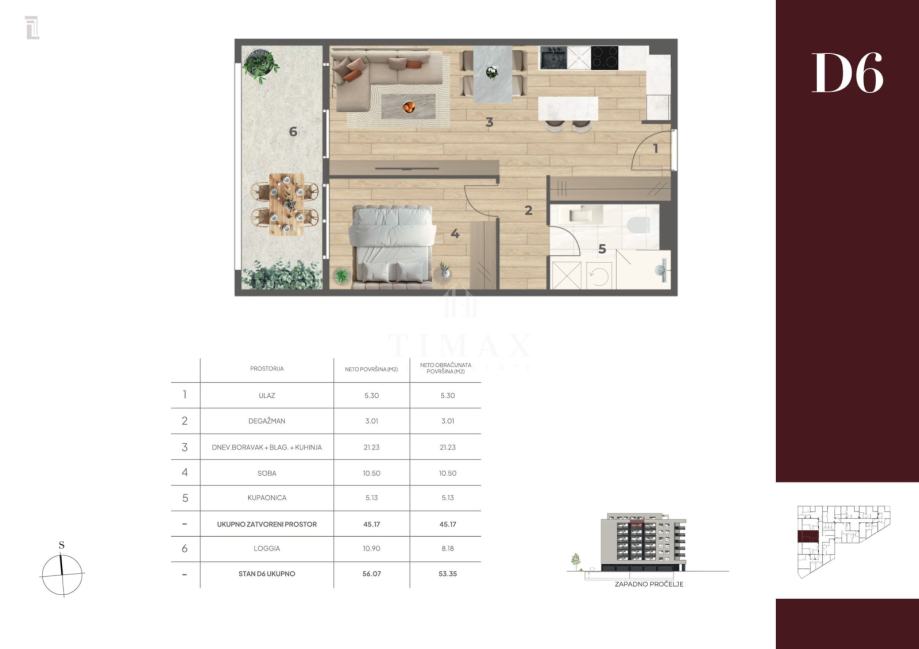 Dvosoban stan oznake D6, na šestom katu, površine 53,35 m2.