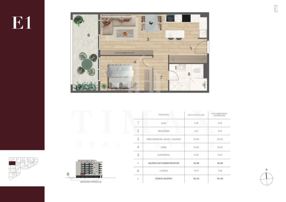 Dvosoban stan oznake E1, na prvom katu, površine 53,48 m2.