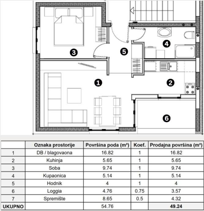 Stan će se nalaziti u visokom prizemlju zgrade stambene površine 44,92 m2. Sadržavat će ulazni hodnik, open-space dnevni boravak/blagovaonicu i kuhinju, spavaću sobu, kupaonicu i loggiu površine 4,76 m2. Stanu pripada i spremište u podrumu veličine 8,65 m2.