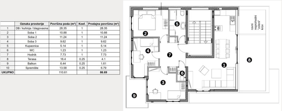 Stan će se nalaziti na drugom katu zgrade, površine 79,9 m2. Sadržavat će ulazni hodnik, open-space dnevni boravak/blagovaonicu i kuhinju, 3 spavaće sobe, kupaonicu, gostinjski wc, prostranu nenatkrivenu terasu površine 16,4 m2 i balkon površine 6,44 m2. Stanu pripada i spremište u podrumu veličine 13,58 m2.