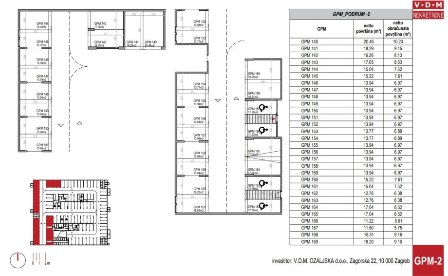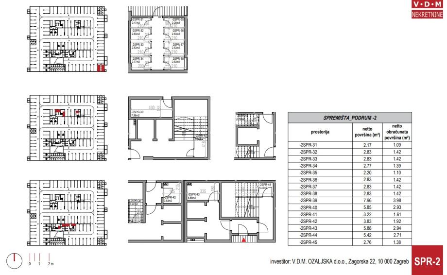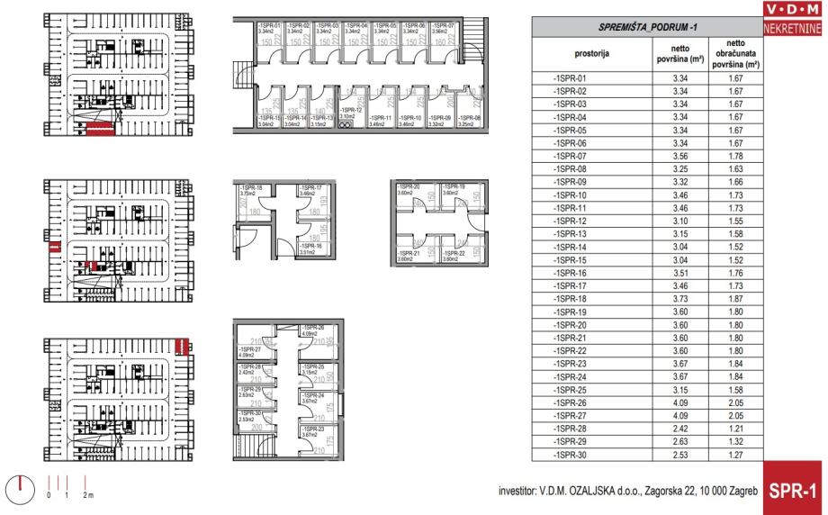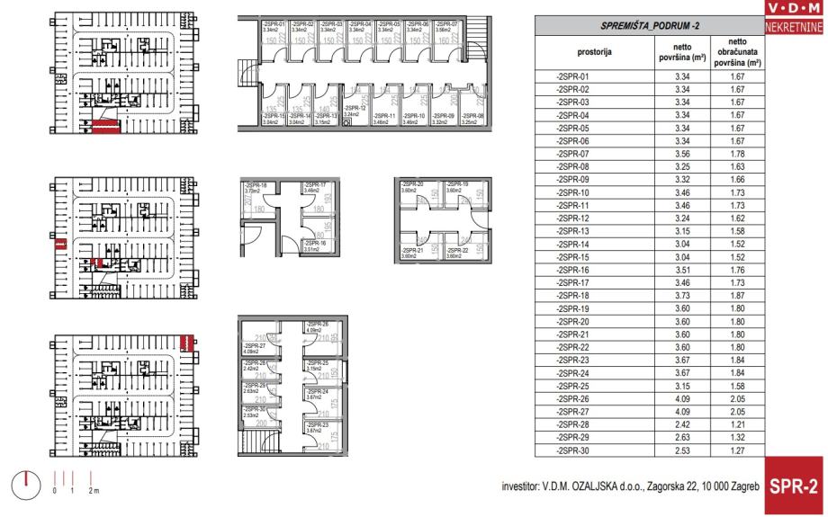 Uz svaki stan obvezna je kupnja najmanje jednog spremišta, smještenog u podzemnoj etaži ili na katovima zgrade. Garažna parkirna mjesta nalaze se u podzemnoj garaži i dostupna su prema želji kupca.