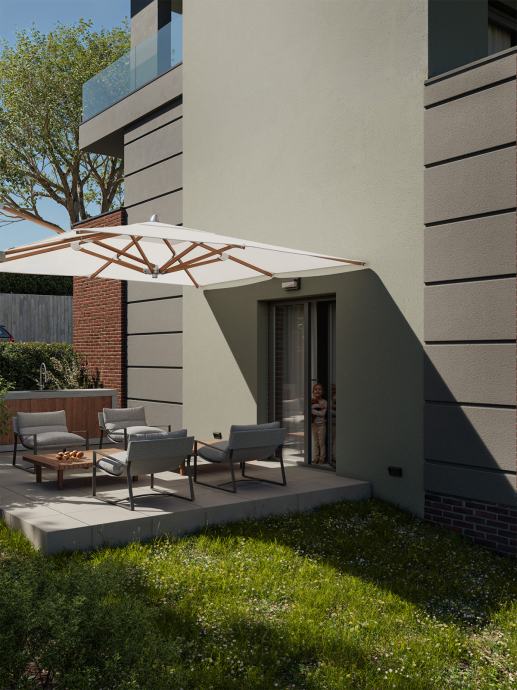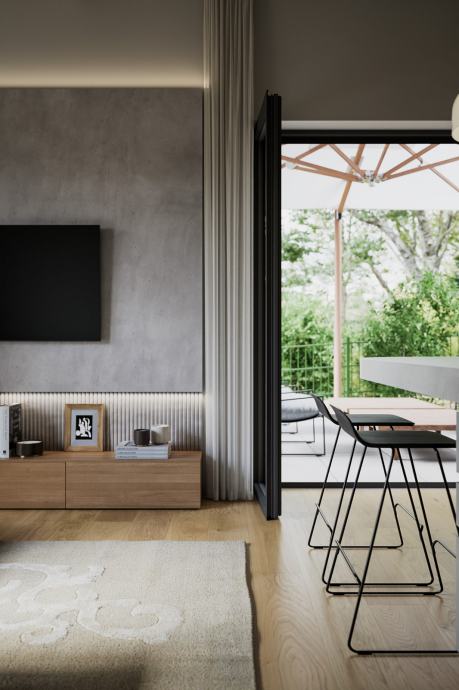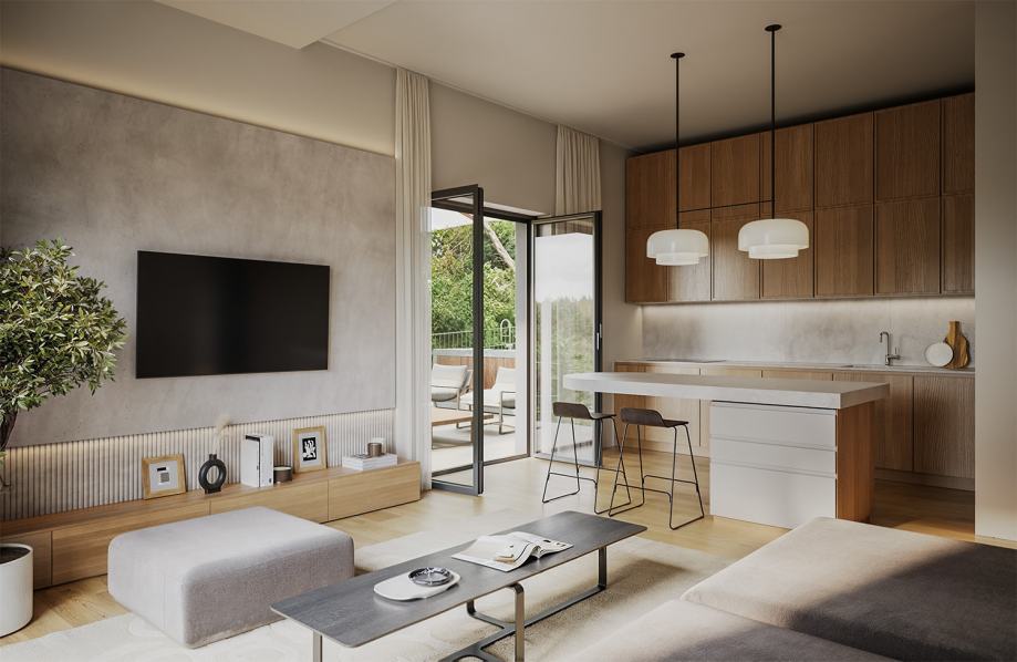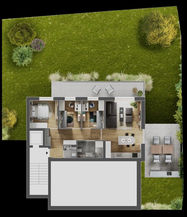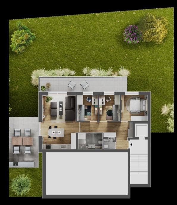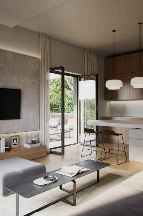 stan Garden - Prostran stan s tri spavaće sobe obračunske površine 97m2 okružen privatnim vrtom od preko 230m², uz koji teče potok Medveščak, pruža idealno okruženje za obiteljski život u harmoniji s prirodom. Visina stropa od 2,95 m dodatno naglašava osjećaj luksuza i prozračnosti.