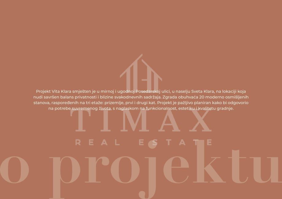Projekt Vita Klara smješten je u mirnoj i ugodnoj Posedarskoj ulici, u naselju Sveta Klara, na lokaciji koja nudi savršen balans privatnosti i blizine svakodnevnih sadržaja.