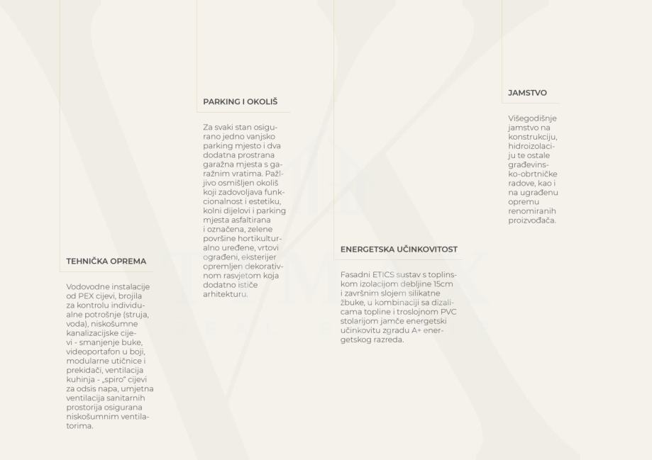 Za svaki stan osigurano jedno vanjsko parking mjesto i dva dodatna prostrana garažna mjesta s garažnim vratima. Pažljivo osmišljen okoliš koji zadovoljava funkcionalnost i estetiku, kolni dijelovi i parking mjesta asfaltirana i označena, zelene površine hortikulturalno uređene, vrtovi ograđeni, eksterijer opremljen dekorativnom rasvjetom koja dodatno ističe arhitekturu.
