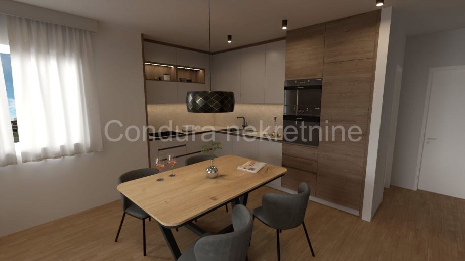 2 spavaće sobe, kupaonica, dnevni boravak, kuhinja s blagovaonicom, lođa, 2 parkirna mjesta, krovna terasa