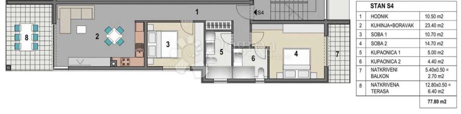 Sam stan, neto stambenog prostora 77.8 m2, će se sastojati od ulaznog prostora i hodnika, gdje će sa lijeve strane od ulaza biti kupaonica i spavaća soba površine 14.7m2 koja će imati svoj izlaz na natkrivenu terasu bruto površine 5.4m2. Ispred ulaznog prostora, također s lijeve strane će biti wc te još jedna spavaća soba površine 10.7m2. Na kraju hodnika se ulazi u prostranu kuhinju i dnevni boravak površine 23.4m2 odakle će se moći izaći na treću natkrivenu terasu bruto površine 12.8m2. Sa stanom dolazi i jedno osigurano parkirno mjesto.