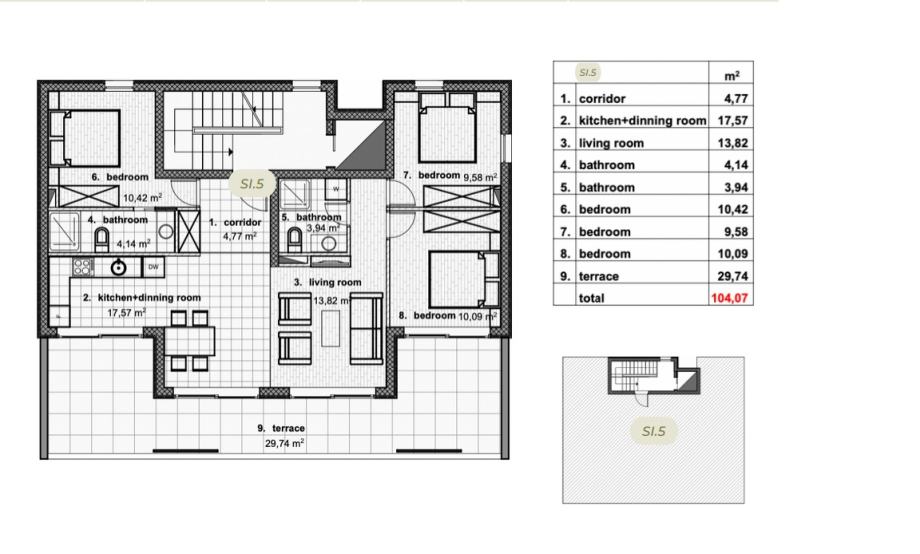 ZGRADA SI, stan SI5 smješten na 2. katu moderne stambene zgrade proteže se na 74,33 m2 unutarnjeg stambenog prostora + 29,74 m2 južno orijentirane terase s koje se pruža otvoren pogled na more.