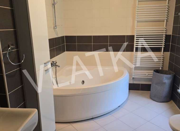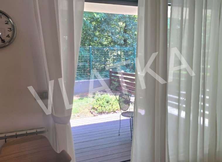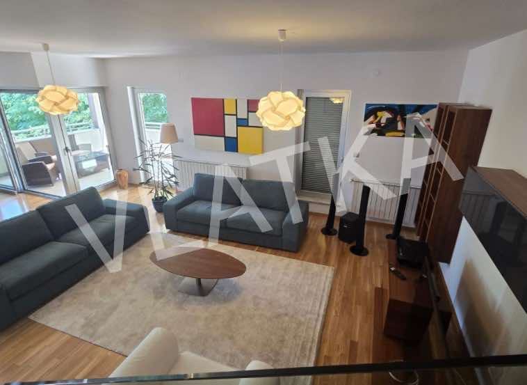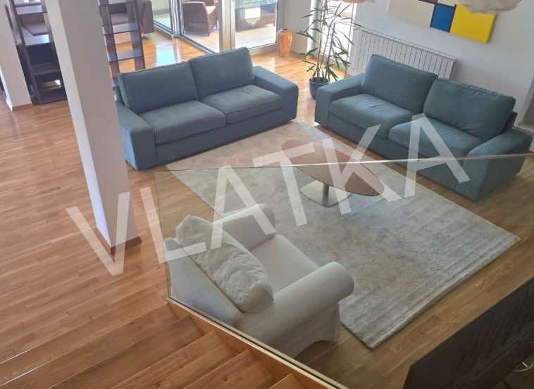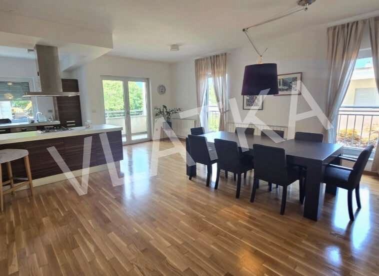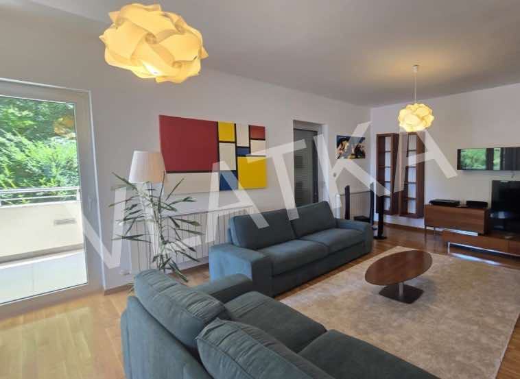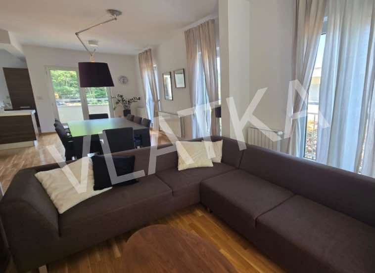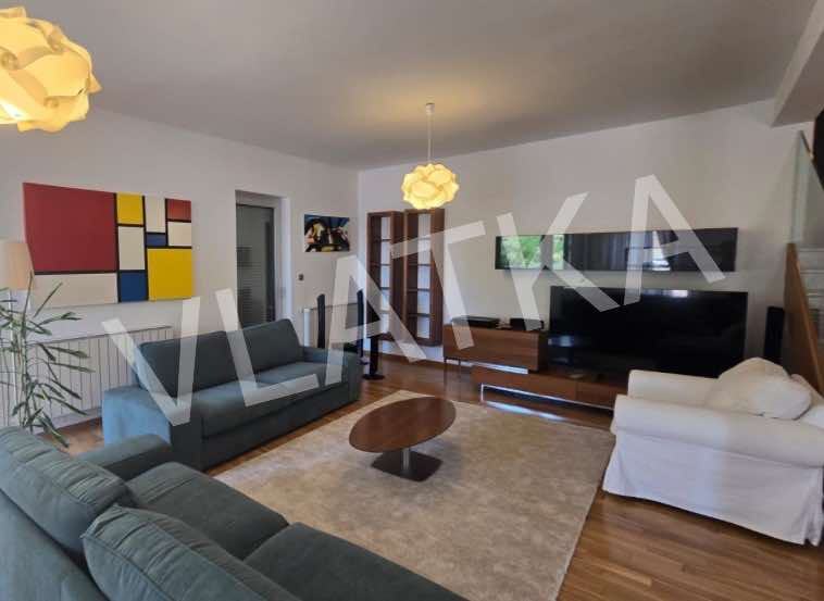 Opremljen kvalitetnim namještajem i aparatima; alarm, električne rolete, podno grijanje.