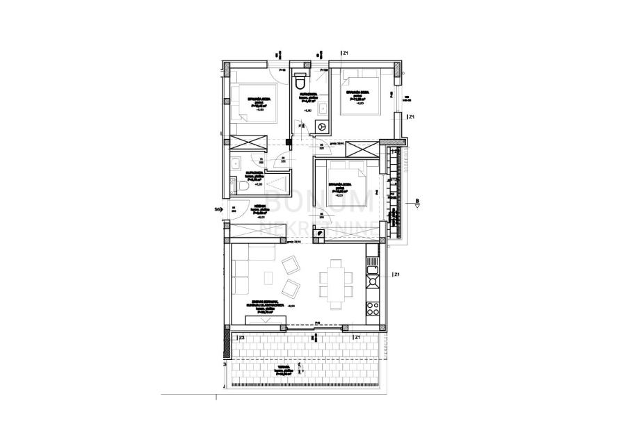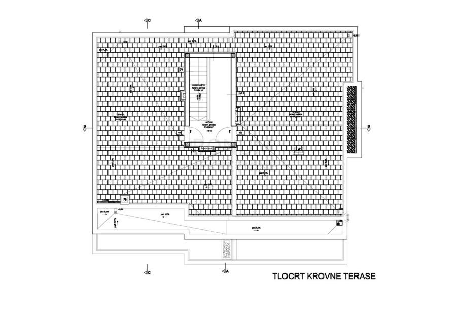 Na prodaju je prostran trosoban stan na drugom katu s velikom krovnom terasom. Ukupna korisna površina iznosi 142,85 m². Stan se sastoji od hodnika, tri spavaće sobe, dvije kupaonice, dnevnog boravka povezanog s kuhinjom i blagovaonicom te terase površine 18,95 m². Unutarnjim stubištem dolazi se na krovnu terasu veličine 85,86 m² s koje se pruža lijepi pogled. Uz stan pripada i jedno parkirališno mjesto.