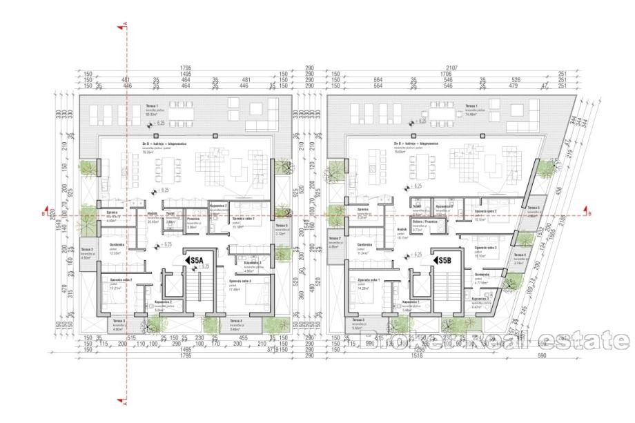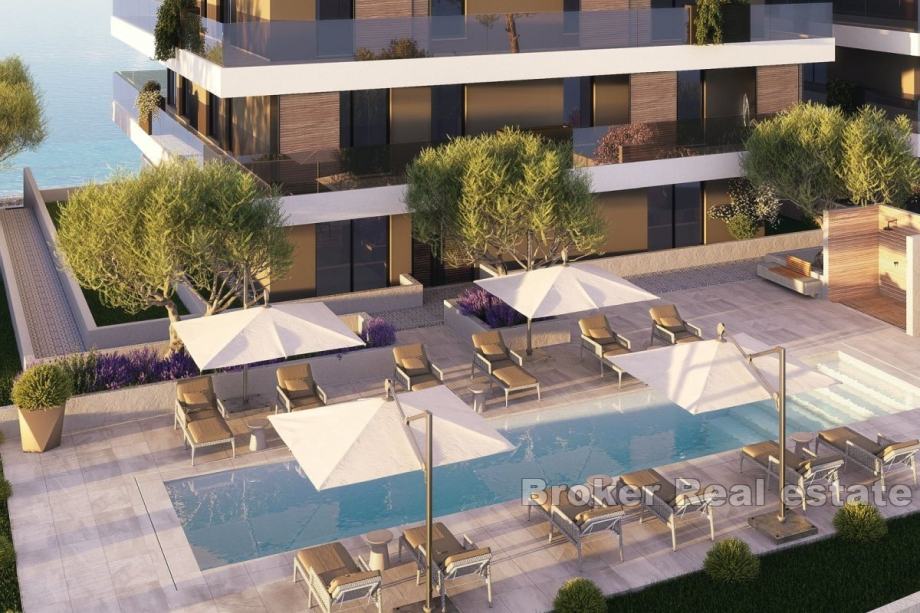 Apartman je pozicioniran na drugom katu zgrade, te ima površinu od 253 m2 i izravan pristup dizalom iz zajedničke podzemne garaže. Uz garažu, na raspolaganju su i veliki zajednički bazen, prostrane sunčane terase te ugodni vanjski prostori za objedovanje. Cijela parcela obiluje uređenim zelenim površinama iza i uz obje zgrade.