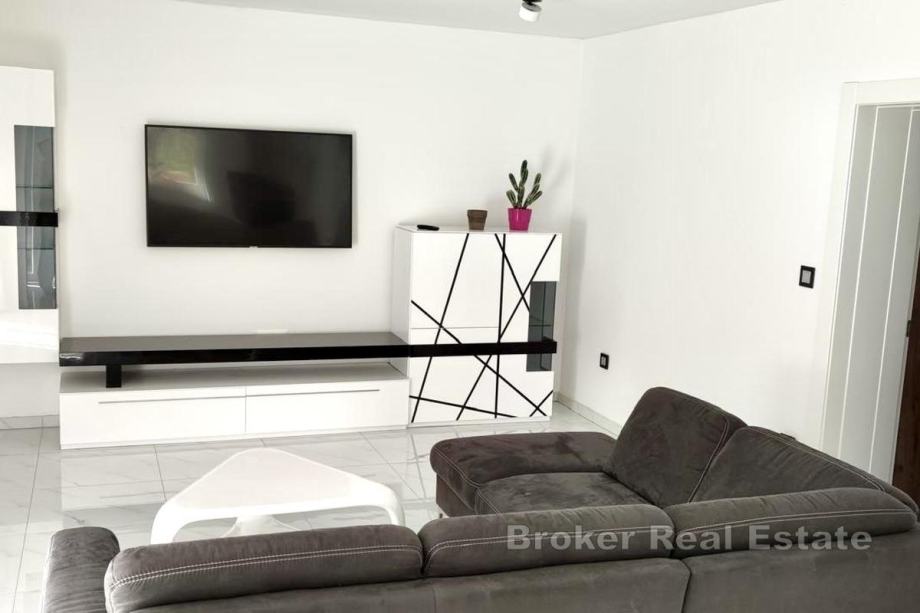 Unutrašnjost se sastoji od prostranog dnevnog boravka povezanog s kuhinjom i blagovaonicom, dvije spavaće sobe te dviju kupaonica koje su opremljene podnim grijanjem. Sve prostorije su klimatizirane, a stan se iznajmljuje potpuno namješten. Pripada mu i jedno vanjsko parkirno mjesto. Zahvaljujući južnoj orijentaciji, stan je tijekom cijele godine obasjan suncem i vrlo ugodan za boravak.