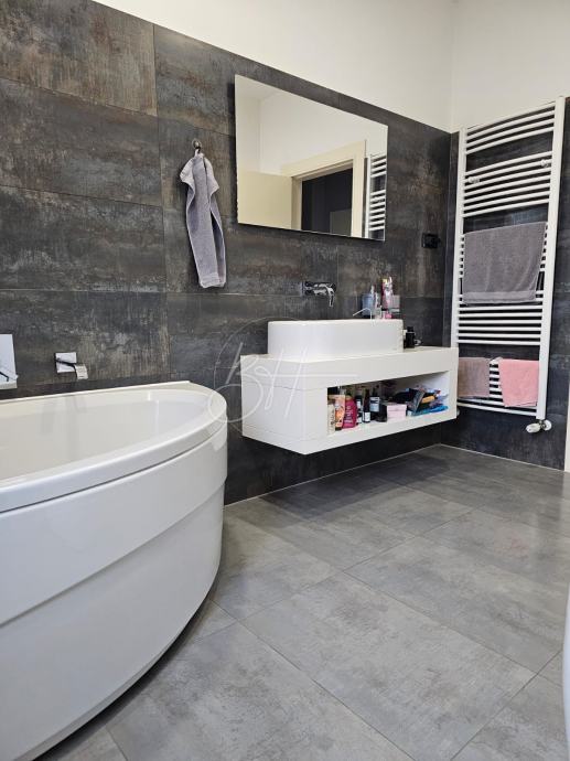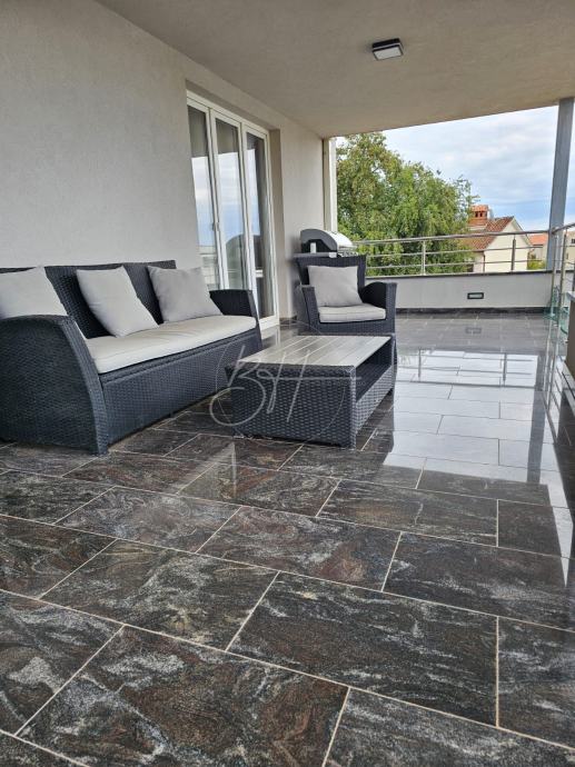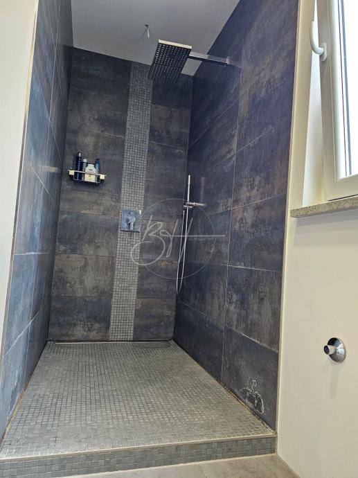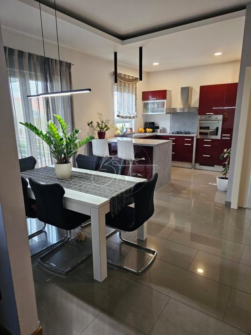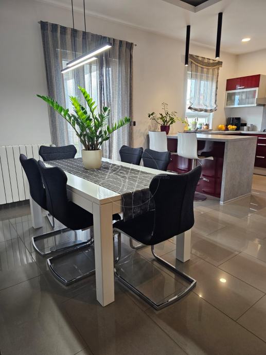 Stan se sastoji od hodnika, velikog dnevnog boravka, kuhinje i blagovaone sa kojih imamo izlaz na prostranu sunčanu terasu popločanu kamenom i ograđenu inoxom na kojoj se nalazi vrtna garnitura i roštilj.